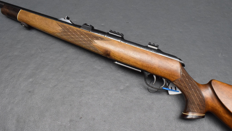 justierbare Visierung, Zylinderverschluß mit Sonnenschliff, deutscher Stecher, seitliche Schiebesicherung, herausnehmbares 3-Schuß Magazin.