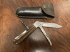 Hier versteigere / verkaufe ich ein kleines, handliches, wenig gebrauchtes Taschenmesser 3 teilig mit Hirschhorn-Griffschalen. Es ist sehr handlich für die Hosentasche oder an den Gürtel. Es besteht aus einer Klinge - ca. 8 cm, einer Säge ca. 7,5 cm und einem Korkenzieher. Es ist Kein PUMA. Die braune Lederhülle hat einen strammen Druckknopf und auf der Rückseite eine Gürtelschlaufe. Messer-Gesamtlänge ca. 10,5 cm. Arretierung der Klinge ist einwandfrei, zum Lösen zwecks einklappen der Klinge auf der Unterseite Knopf drücken. Ganz geringe Lager-Flecke, siehe Bilder. Privatverkauf. Versand innerhalb Deutschland. Altersnachweis erforderlich.