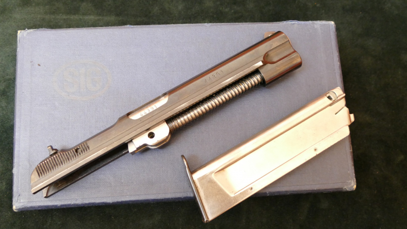 SIG Mod. 210 Wechselsystem, Kal. .22lr, Erhaltungszustand sehr gut (leichte Gebrauchsspuren). Lauf (Lauflänge 12,5cm/5") selbstverständlich blank. Die Waffe verfügt über eine starre Visierung. Ein Magazin gehört mit zu dem System, ebenso wie die original Verpackung (wobei bei dieser der innenliegende Schaumstoff komplett zerbröselt ist).