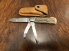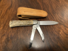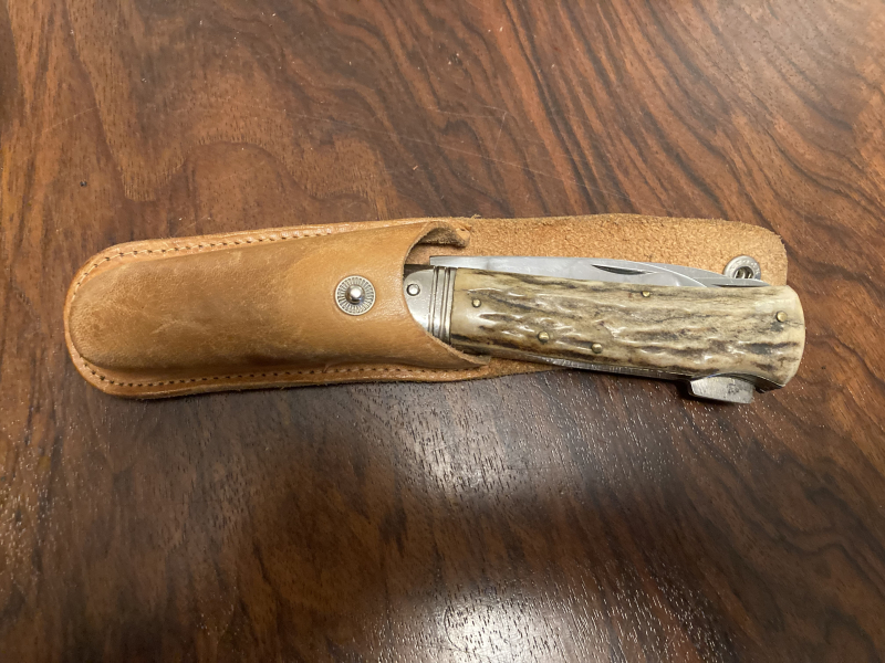 Hier versteigere / verkaufe ich ein Taschenmesser 3 teilig mit Hirschhorn-Griffschalen. Es ist handlich, auch noch für die Hosentasche oder an den Gürtel. Es besteht aus einer Klinge ca. 9 cm, Aufbrechklinge ca. 7,5 cm, einer Säge ca. 9,3 cm. Es ist kein PUMA. Die hellbraune Lederhülle hat einen strammen Druckknopf und auf der Rückseite eine Gürtelschlaufe. Arretierung der Klinge ist einwandfrei. Gesamtlänge ca. 11,3 cm. Ganz geringe Lager-Flecke, siehe Bilder. Privatverkauf. Versand innerhalb Deutschland. Altersnachweis erforderlich.