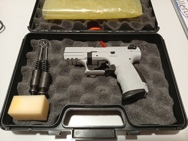Zum Verkauf steht eine Walther P22Q P.A.K. in Concrete. In neuwertigem Zustand und nie geschossen. Handlich, leicht und Zuverlässig: Die kompakte Walther Schreckschusspistole P22Q kommt im Kaliber 9mm P.A.K. und basiert auf einer technischen Weiterentwicklung der Walther P22. Aufgrund der kompakten Bauweise - in Kombination mit dem leichten Gewicht und der seit Jahren bewährten/zuverlässigen Funktion - wird die Walther P22Q besonders gerne zum Führen verwendet (Führen nur mit kleinem Waffenschein). Auch für das Silvesterschießen ist dieses Schreckschusspistolenmodell immer eine gute Wahl. Das geringe Gewicht verdankt die P22Q dem schlagfestem Polymer-Griffstück. Die Hi-Grip® Oberfläche sorgt für optimales Handling und rutschsicheren Halt - auch bei feuchten Händen ist ausreichend Grip vorhanden und die Pistole rutscht nicht aus der Hand. Das Magazin bietet Platz für 7 Schuss Platzpatronen im Kaliber 9mm P.A.K.. Zum Laden wird das Magazin einfach aus der Pistole herausgezogen. Natürlich lassen sich mit der Walther P22Q Schreckschusspistole auch CS- und Pfeffergaspatronen verschießen. Für Rechts- und Linkshändern geeignet. Lieferumfang: Walther P22Q 9mm P.A.K. Abschussbecher für Signalmunition Reinigungsbürste Waffenkoffer Handbuch Details zu Walther P22Q 9mm P.A.K. Schreckschuss Pistole: Kaliber: 9mm P.A.K. Munition: Knall-/Platzpatronen, CS- und Pfeffergas im Kaliber 9mm P.A.K. verschießt Signaleffekte und Pyromunition mit aufgestecktem Abschussbecher Magazinkapazität: 7 Schuss Abzug: Single- und Double-Action Sicherung: Schlagbolzensicherung Material Schlitten: Metall Material Pistolenkörper/Griffstück: Schlagfester Polymer Griffstück mit rutschfester Hi Grip® Oberfläche Gesamtlänge ca. 15,4 cm Lauflänge ca. 9 cm Gewicht ca. 480 g