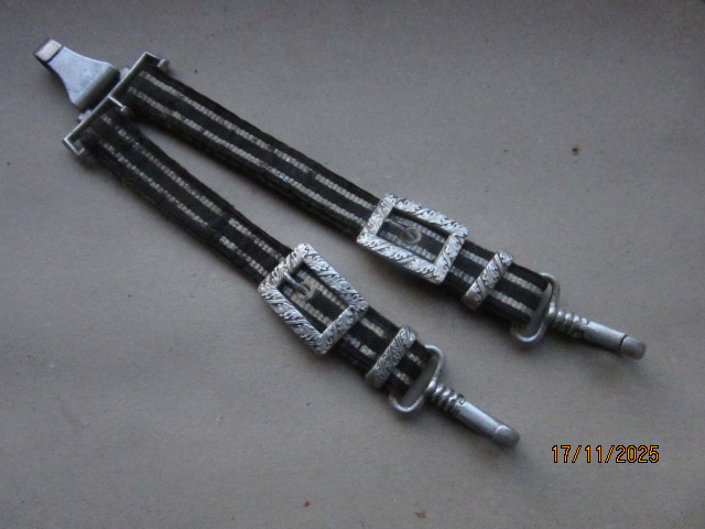 Einwandfreies schönes Original. Das Textilband zeigt Altersspuren. Die Rückseite (siehe Bild 6) sieht im Urzustand anders aus. Wenn dem Träger das Gehänge zu lang war, hat er oftmals die Gewebe-Teile am oberen Klip einfach umgenäht. Alle Alu-Teile sind unbeschädigt und iin dieser Zusammenstellung nicht häufig zu finden.
