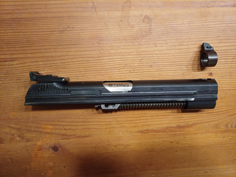 SIG 210 Wechselsystem 7,65 mm (.30 Luger) mit originaler Sportvisierung und Schließfederstange. Komplett. Spiegelblanker Lauf, scharfe Züge und Felder, quasi "nie" geschossen...