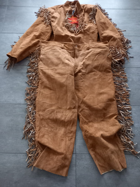 Ein Wildlederanzug mit Fransen. Er ist neuwertig und in der Größe XXXXL, Europäische Größe wäre dann ca. 60/62 , den Rest siehe Bilder. Bitte auch meine anderen Auktionen beobachte.