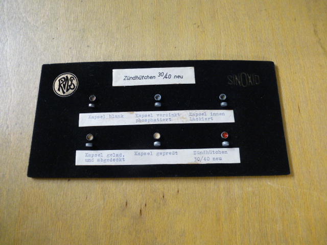 RWS - Musterkasten / Schautafel - Zündhütchen-Herstellung für Jagdbüchsenpatronen.***********Die Zündhütchen enhalten keine Zündmasse.***********Zustand: Schautafel gebraucht - noch gut. Der dazugehörige Kasten gebraucht - ausreichend mit einigen Beschädigungen.*********Abmessung-Schautafel: 22x10,5cm (BxH). Abmessung-Kasten-außen: 11,5x23x2,5cm (HxBxT).*********Privatverkauf ! Keine Garantie ! Keine Gewährleistung ! Keine Rücknahme !********Kein Verkauf ins Ausland ! No sale abroad !********Kein Versand ins Ausland ! No international shipping !**********Versand erfolgt als DHL-Paket für 8,- EUR.