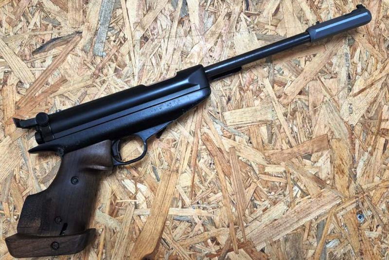 Feinwerkbau Luftpistole Seitenspanner. Die Luftpistole war eine Vereinswaffe und ist nicht mehr einwandfrei Funktionsfähig. Das Original Korn existiert nicht mehr.