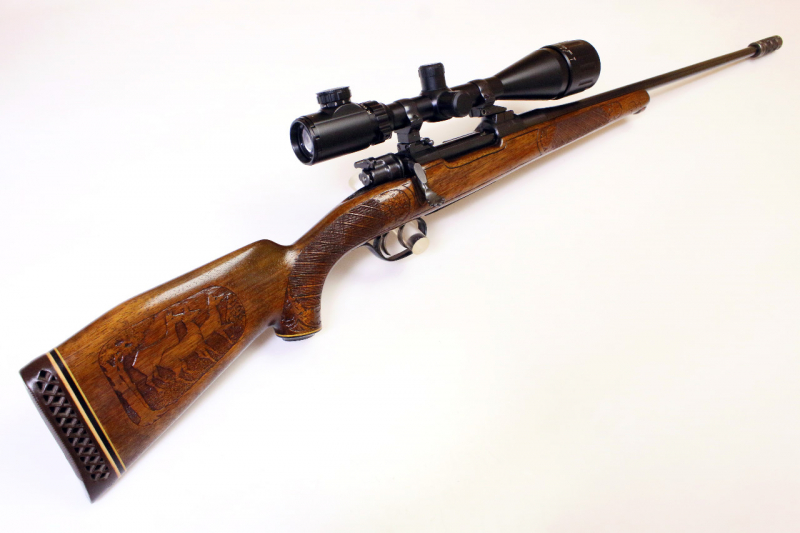 - reichhaltig beschnitzter Nussholzschaft (Eichenlaubdekor), gummierte Schaftkappe, bayrische Backe, Fischhautverschnitt an Schaft & Vorderschaft, Tropfnase