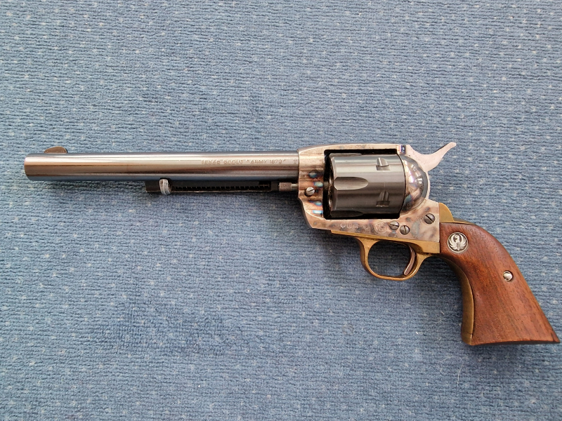 Sicherheitshalber schreibe ich "leichte Gebrauchsspuren", doch wie Sie den Bildern entnehmen können, ist der Revolver in sehr gutem Zustand und nach Aussage des Vorbesitzers unbeschossen. Es handelt sich um einen Texas Scout Army 1873 mit der frühen PTB 189. HS Mod. 121 B, Cal.9mm Knall von H. Schmidt, Ostheim/Rhoen.