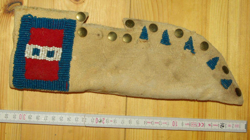 Messerscheide mit innenliegender Rohhaut. Ein Messingnägel fehlt!