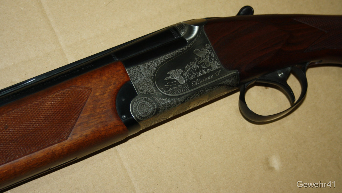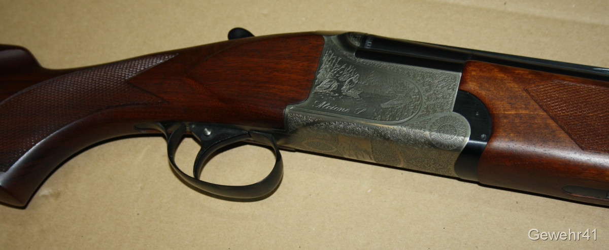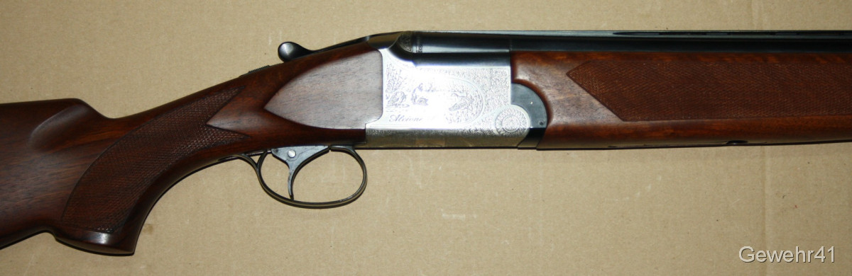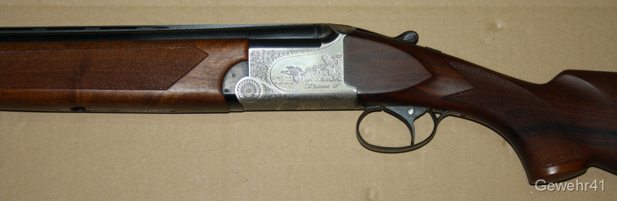 Sie bieten auf diese wunderschöne, absolut neuwertige Bockdoppelflinte von Franchi Modell "Alcione S" im Kal. 12/70 mit Ejektoren. Gesamtlänge 114cm, Lauflänge 71cm.