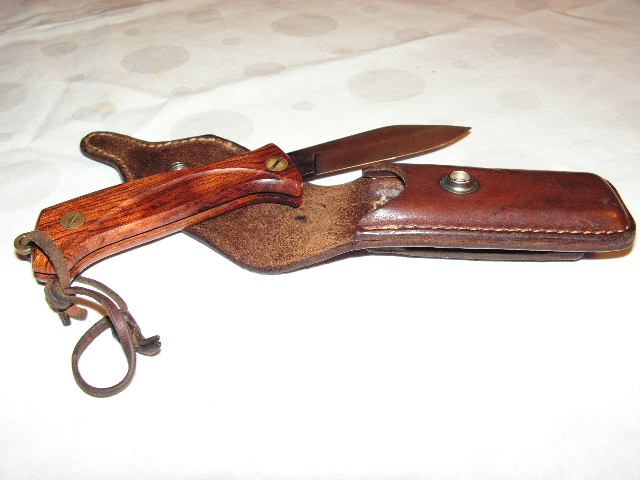 Die ehemalige Brünierung der Klinge ist vom Reinigen abgetragen, was dem Messer Charme gibt. Das Holster hat Patina, wie es sich gehört und aufwertet.