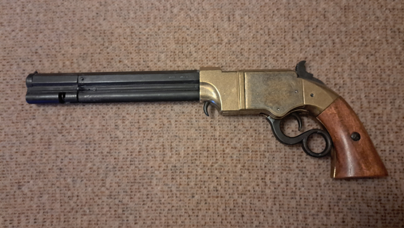 Biete hier ein historisch sehr interessantes Modell der Volcanic Repetierpistole aus dem Jahr 1856. Das Repetiersystem war identisch mit dem Volcanic-Gewehr, dieses wiederum war der Vorläufer des Henry-Gewehres und später der Winchester 66/73 usw. Die Pistole lässt sich spannen und abschlagen, das Röhrenmagazin kann man zum "Laden" vorn beiseitedrehen. Es handelt sich um ein Modell aus Metallguss und Holz. Es ist ca. 1,3 Kilo schwer und ca. 39 cm lang.
