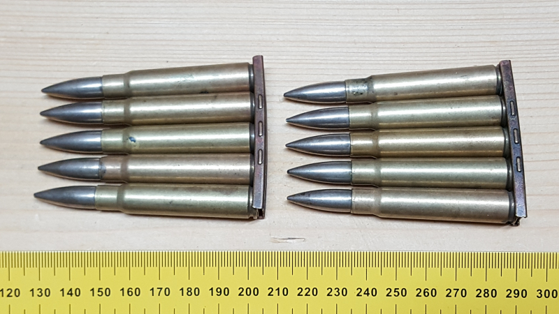Sammlermunition: 10 Dekopatronen 7,9- 1.WK Deutsch auf Ladestreifen.