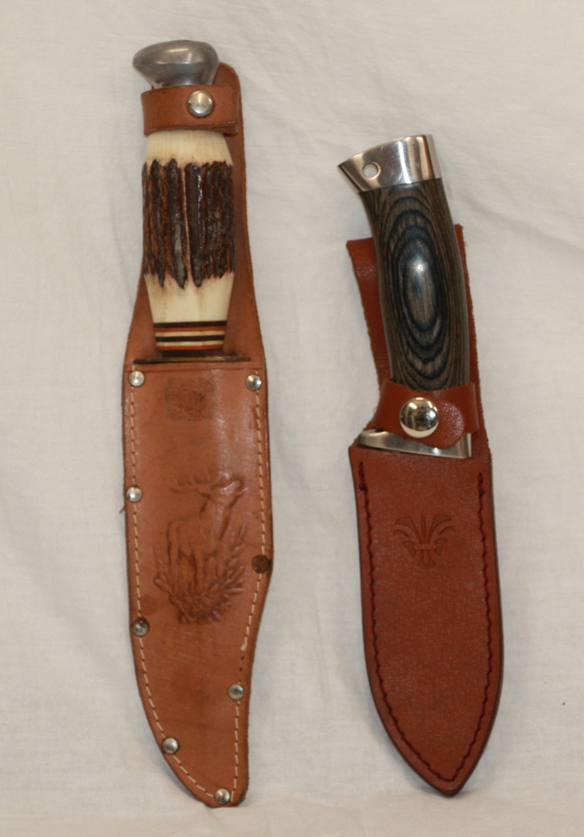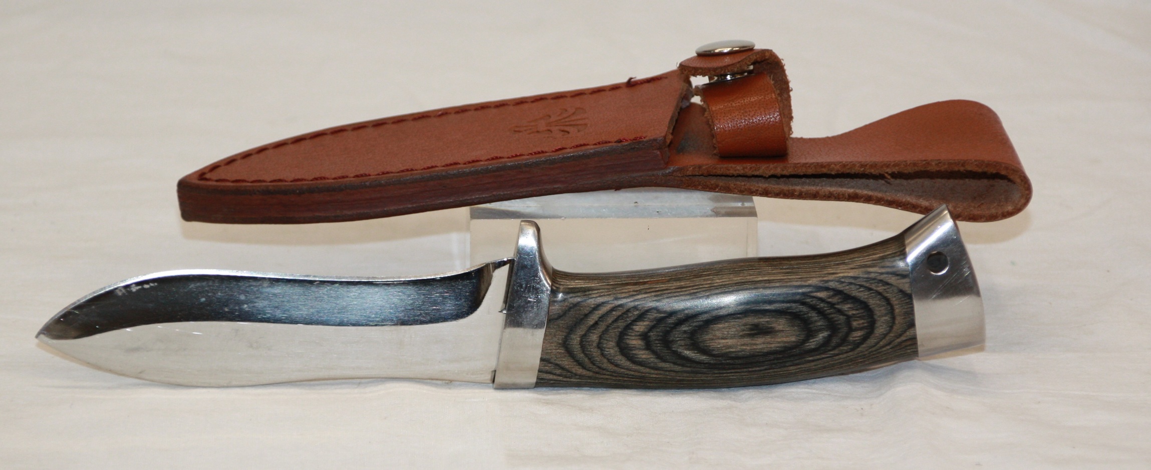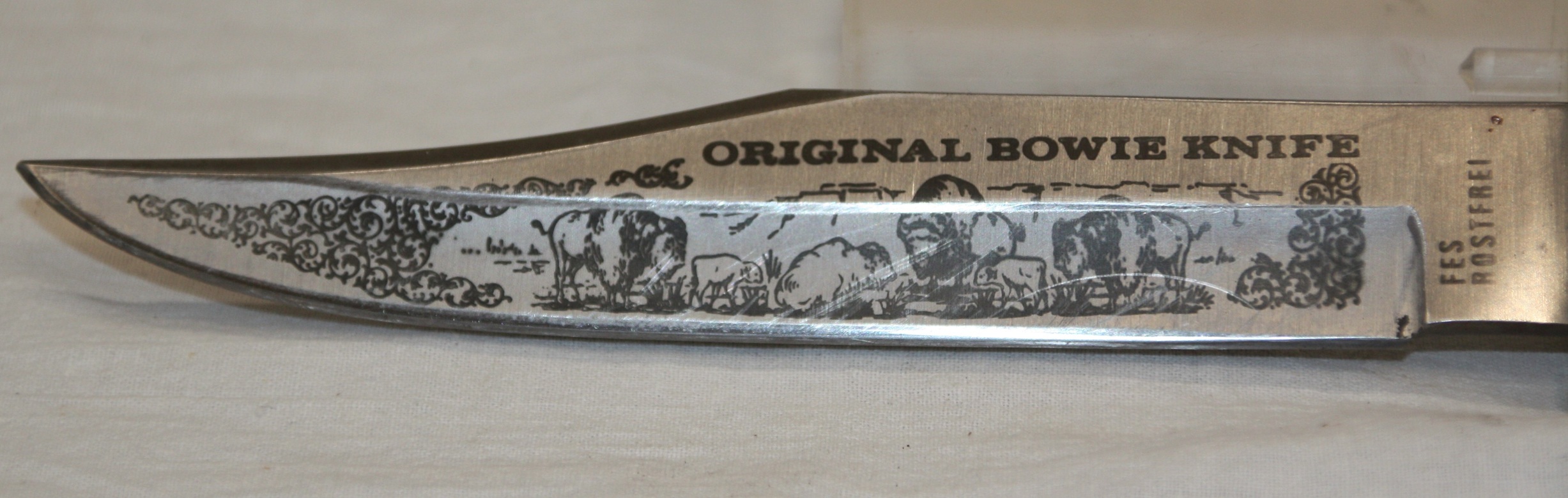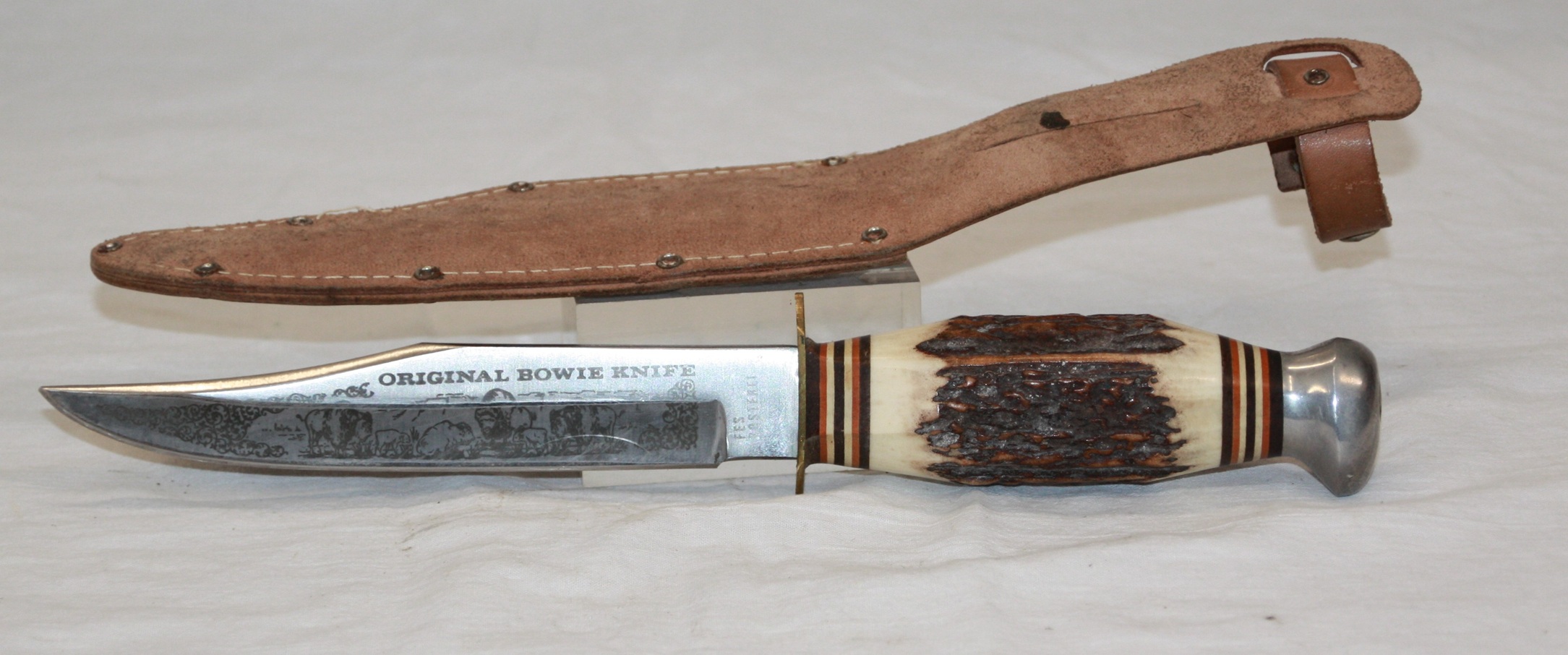 1. ORIGINAL BOWIE KNIFE in guten Zustand. Total 27 cm. Klinge 14 cm. Scheide markiert: Made in Germany.