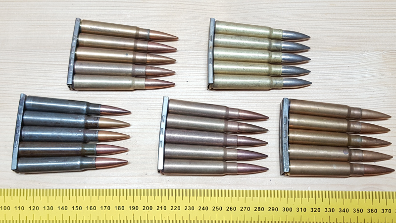 Sammlermunition: 25 Dekopatronen 7,9x57 Deutsch 2.WK. auf Ladestreifen.
