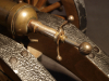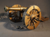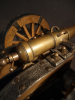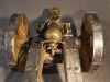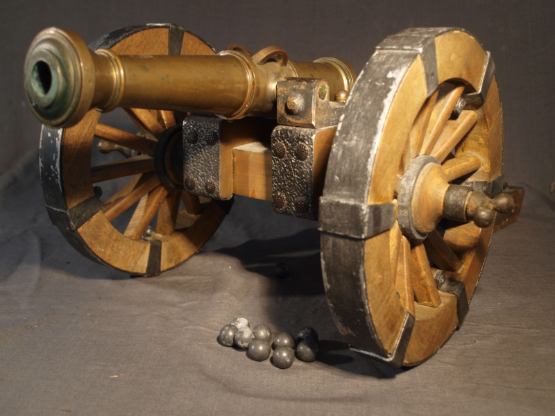 Ein schönes historisches Bronzerohr, eine ausgesprochen massive Buchholzlafette und diverse aufwändige Beschläge – das sind die Elemente, aus welchen dieses handwerklich meisterhaft gefertigte Modell einer Vorderladerfeldkanone aus der Zeit um 1800, gefertigt ist. Das sehr formvollendete und äußerst sauber angefertigte, ca. 38 cm lange Bronzerohr, welches am Stoßboden 60 mm breit ist, verfügt über einen äußerst interessanten Zündmechanismus: Mittels eines wunderschön ausgeformten Kugelhebels lässt sich ein ca. 40 mm langes Stahlelement aus dem Rohr ziehen und rastet nach dem Verschließen karabinerartig wieder ein. Mit einem etwas zierlicheren Hebel an gleicher Stelle lässt sich ein herausziehbarer Schlagbolzen spannen, arretieren und durch anheben des Hebels auslösen. Das formvollendete massive Bronzerohr hat eine wunderschöne natürliche Patina angesetzt. Evtl. ist das Rohr erheblich älter als die Lafette selbst. Die ausgesprochen wuchtige Lafette ist aus 40 mm starken Buchenholzelementen gefertigt. Ähnlich massiv und ausgesprochen ordentlich sind auch die Speichenräder erstellt worden. Die Radnaben sind mittels, offensichtlich hierfür angefertigten Flügelmuttern, deren Flügen in Kugeln auslaufen, gesichert. Ausgesprochen stark dimensioniert sind auch die Schildzapfenschlösser. Diese sind allerdings nicht aus Bronze sondern aus Stahlelementen angefertigt. Eine Richtspindel, welche kraftschlüssig mit dem Rohr verbunden ist, ist für die Höhenjustierung zuständig. Die insgesamt sehr solide Ausführung, aber auch die Schmauchspuren am Zündloch, welches sich zwischen den Rohrhenkeln befindet, und an der Mündung zeigen, dass mit dieser Kanone mittels Schwarzpulver geschossen wurde. Das einzigartige Kanonenmodell dürfte kurz nach der vorletzten Jahrhundertwende entstanden sein, also um 1910, und wird damit deutlich über 100 Jahre alt sein.
