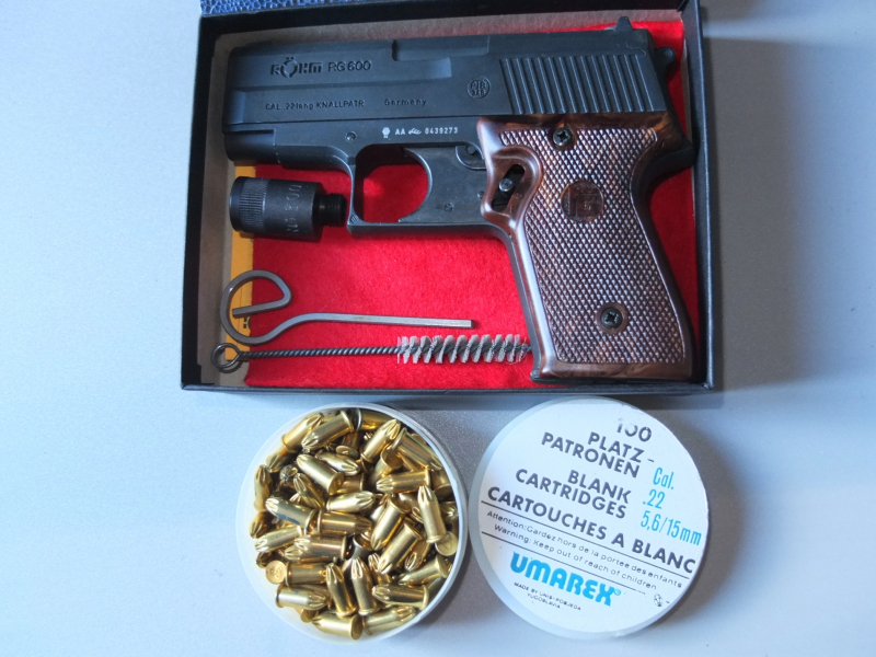 Röhm RG600 Pistole für Cal. 22 Platzpatronen. 10-Schuss Magazin. Zustand: sehr gut, kaum geschossen. Zustand siehe auch Fotos. Mit gut erhaltener original Verpackung - Abschussbecher für Signalmunition, Reinigungsbürste, Hülsenausstoßer und originaler Bedienungsanleitung. 100 Knallpatronen gehören auch dazu.