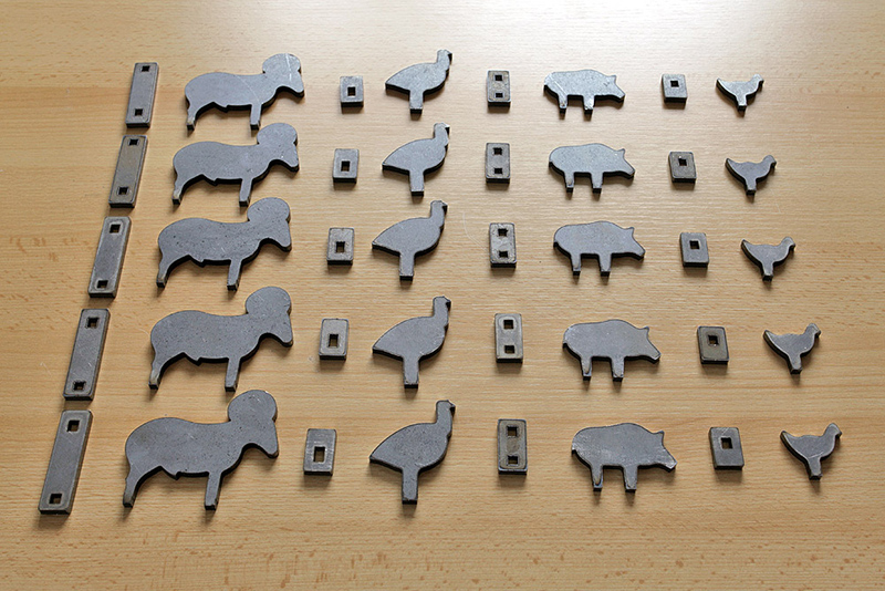 1 komplettes Set besteht aus 5 Händeln, 5 Schweine, 5 Truthühner, 5 Widder samt Fußteile. sie sind nicht zusammengeschweißt