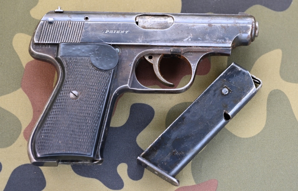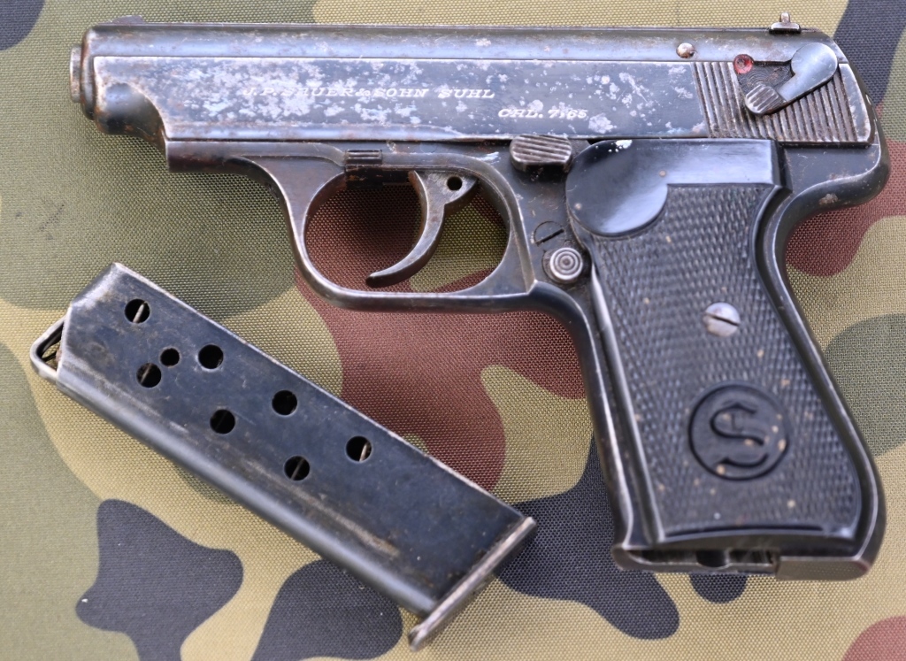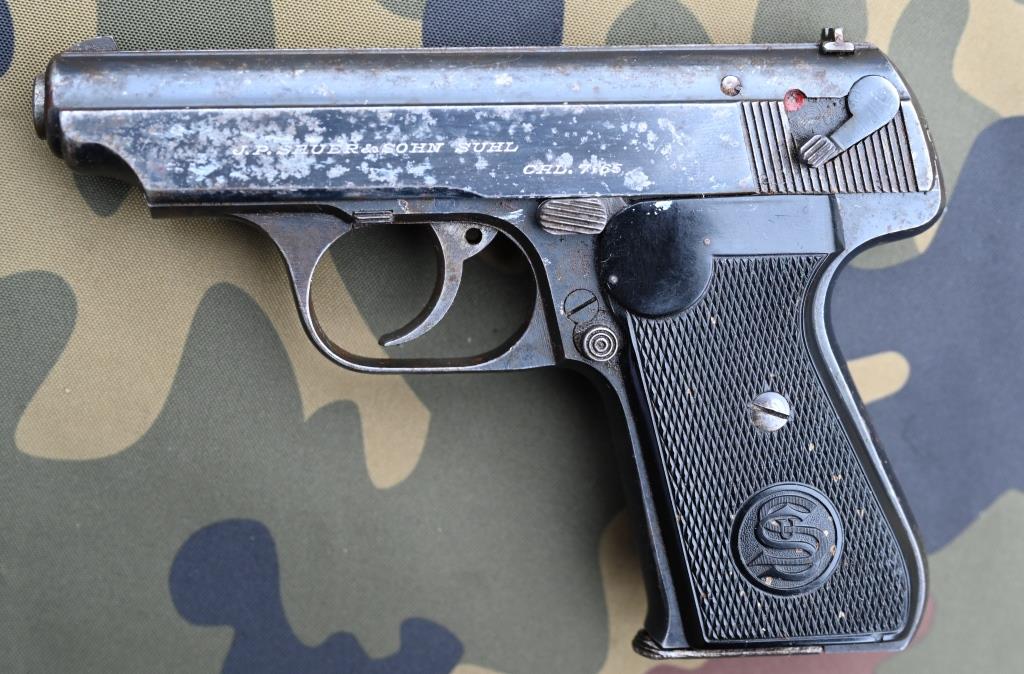 Auf der linken Schlittenseite Herstellerschriftzug "J.P. SAUER & SOHN SUHL" sowie Kaliberangabe "CAL. 7,65", alte Beschusszeichen Adler über N auf dem Griffstück rechts, unterhalb der Seriennummer "267931", sowie auch rechtsseitig auf dem Schlitten, links von den Griffrillen. Der ganz leicht flugrostige Magazinboden des ansonsten guten Magazins zeigt ebenfalls das Herstellerlogo wie die Griffschalen und die Kaliberangabe.