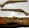 Original orientalische Vorderladerpistole, Steinschloss, jedoch ohne Schloss, vorhanden sind der Lauf, die Gegenplatte des Schlosses, die Kolbenkappe, der Abzug, Abzugsbügel, Ladestockhülsen, Laufbänder und natürlich der Schaft. Letztlich fehlt nur das Schloss. Zum Restaurieren oder Ausschlachten. Lauflänge 29,8 cm, Gesamtlänge 48 cm, Kaliber 16,2 mm, Rostpatina