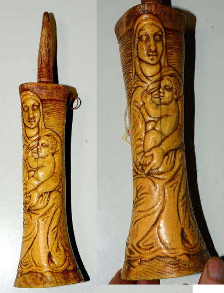 Pulverhorn aus dem 17./18. Jahrhundert, offenbar aus Beinknochen eines Rind hergestellt, eingeschnitztes Relief "Maria mit Jesus im Arm", Länge ohne Tülle 20 cm, 41-74 mm dick, guter Zustand