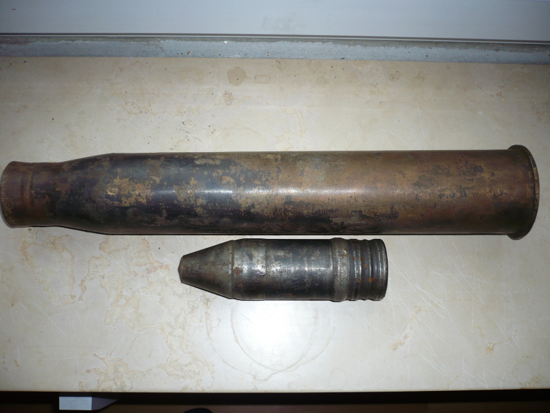 Siehe Bild. Stahlhülse mit Schraube insgesamt rauher Zustand , Hülsenmund etwas geweitet. Geschoss relativ gut erhalten. Teil enthält keine verbotenen Stoffe.