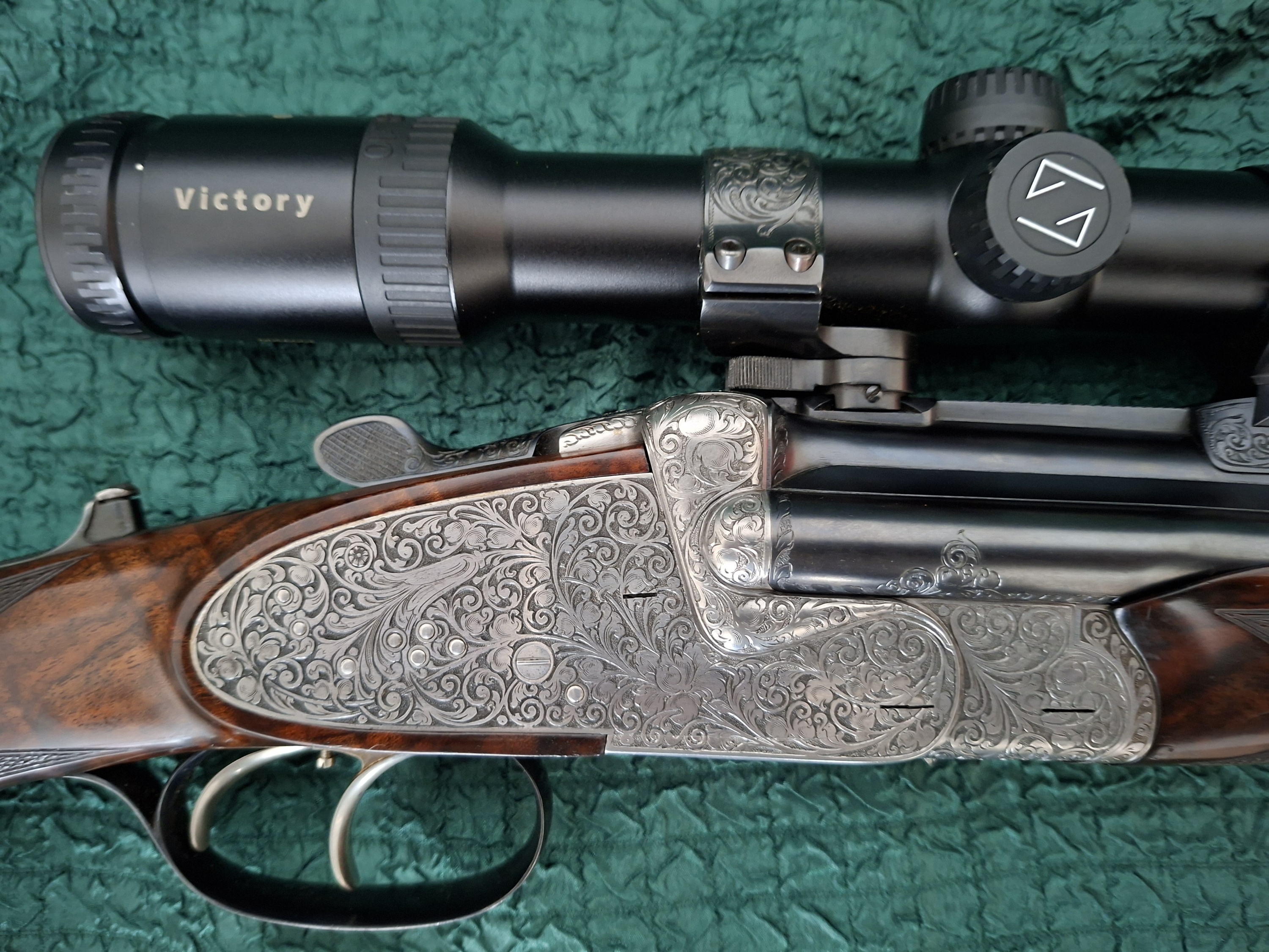 Gravuren: besonders reichhaltige und im Detail fein gestaltete altdeutsche Laubgravuren auf System, Seitenschlossen, Abzugsbügel, Muscheln, Scheibe, Schnäpper und Zielfernrohr-Montageteilen (Laufsockel und Ringen)