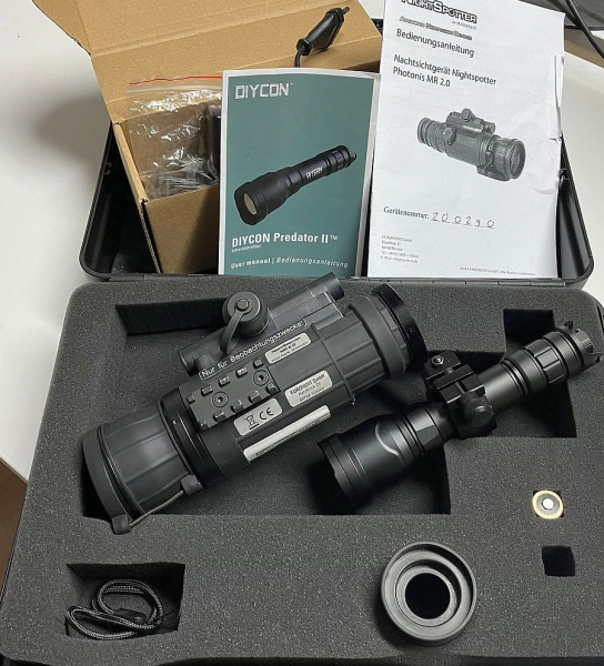 Zum Verkauf steht ein Nightspotter 2 Vorsatzgerät mit Photonis-Bildröhre, inklusive IR-Strahler Dycon Predator 2 sowie Originalkoffer.