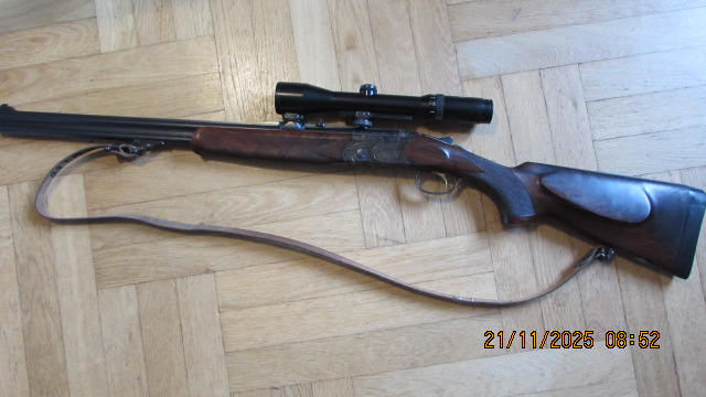Dt. Backe, selektiver Einabzug, Schiebe-Umschaltsicherung auf dem Kolbenhals; exclusive Bock-Büchse mit Flankenverschluss, Ejektoren, buntgehärtete Basküle mit kleiner Gravur mit Herstellernamen und Modellbezeichnung und partiellem Randstich, leicht rechts geschränkt, der Oberhebel steht noch rechts, demzufolge ist der Verschluss auch noch sehr stramm und dicht, gültiger Beschuss ist vorhanden; die Schussleistung wurde nicht überprüft und wird auch nicht garantiert; ZF Schmidt & Bender 1,5-6x42 Abs. 4 mitvergrößernd mit Außenschiene auf Eramatic Schwenkmontage in tadellosem Zustand.