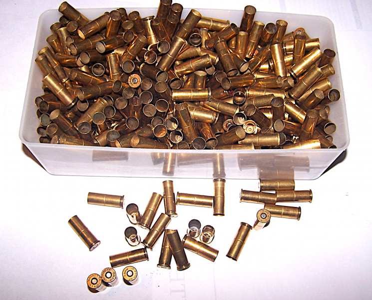 450 St. Hülsen Kal. .38 von GECO. Die Hülsen sind gereinigt, kalibriert und angetrichtert für die Aufnahme von Geschossen. Die Hülsen wurden nur einmal abgeschossen. Zündhütchen CCI. (Der Schrottpreis der Hülsen beträgt 4,70/Kg). Das Gebinde gehört nichtz zur Auktion.