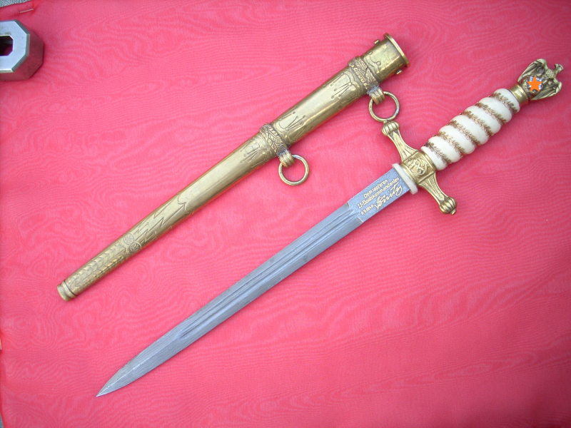 Ehrendolch mit Brillanten der Kriegsmarine mit Widmung “Dem tapferen U-Bootskommandanten” von Großadmiral Dönitz vom 9. Mai 1940. Diese Ehrendolche wurden seinerzeit nur in ganz geringer Stückzahl ausschließlich von der Fa. Eickhorn gefertigt. Ein Original mit diesem Verleihungsdatum erhielt seinerzeit der berühmte Schwerterträger Erich Topp für seine herausragenden Leistungen als U-Boot-Kommandant. Blitze auf der Scheide umlaufend. Klinge mit sehr feinem Ätzdamast und magnetisch, Widmung und Eickhornlogo erhaben und vergoldet. Keine Haltefeder und kein Drücker, genau wie beim unbezahlbaren und nicht beschaffbaren Original. Zum Adler: es wurde hier auf den Adler, wie beim Original, ein silberfarbenes und mit 17 Simili-Steinen besetztes Hakenkreuz aufgelegt, die bei entsprechendem Lichteinfall herrlich funkeln. Sehr seltene Gelegenheit zum Erwerb eines solchen Dolches, die wohl so schnell nicht wiederkommt. Keine Garantie und keine Rücknahme.