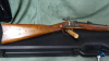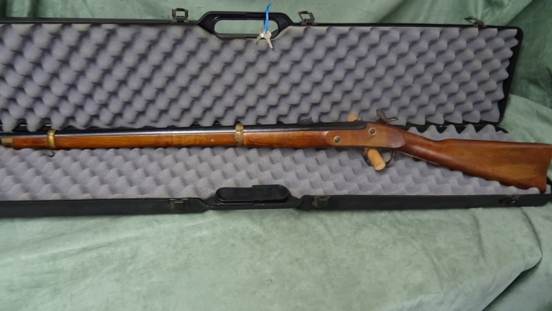 Gebrauchtes Perkussionsgewehr von Euroarms, Made in Italy, Kaliber .58BP. Schönes Replik des US Model 1863. Die Waffe ist ungeschossen, es sind leider einige Lagerstellen vorhanden. Direktabzug. Runder Lauf , schwarz brüniert. 2 Klappen Visier, Korn ist mit Schwalbenschwanz. Perkussionszündung, Seitenschloß ist bunt gehärtet mit Adlergravur, komplett mit Ladestock. Patchbox, Rohrbänder, Abzugsbügel und Schaftkappe in Messing. Schaft ohne Backe. Der Lauf läßt sich zum reinigen aushängen. Der Vorderschaft ist 2 geteilt. Lauflänge ca. 86cm, gesamt ca. 123cm.