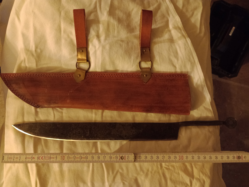 Ich biete euch ein sehr schönes Schmiedemesser mit dazugehöriger Scheide aus Leder, die es ermöglicht, das Messer horizontal am Gürtel zu tragen. Wie auf den Bildern zu sehen, ist nur die Schneide angeschliffen (scharf) und der Rest im rohen Schmiedezustand belassen.