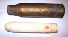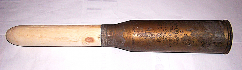 Hülse 35x60 mm. Beschriftet: UBR 2810 usw... Metallhülse abgeschossen, ohne Gefahrenstofffe. Dazu habe ich ein 20cm langes Holzdummy gedrechselt, dass beliebig bearbeitet werden kann.