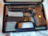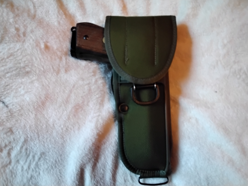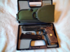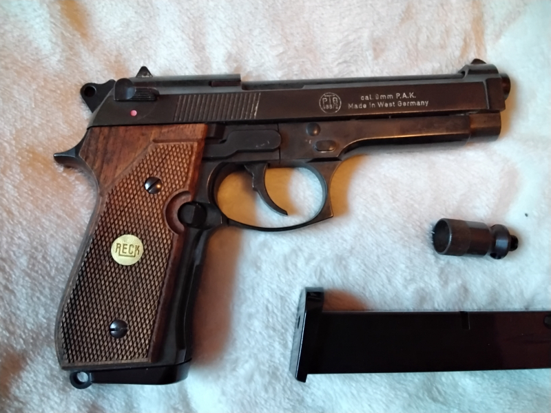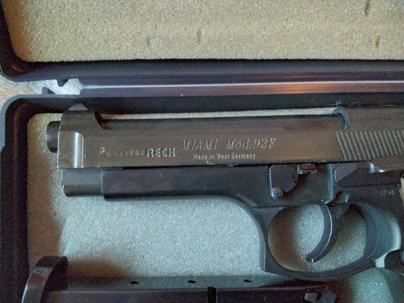 Es handelt sich um Pistole Reck Miami 92, noch Made in W.-Germany. Mit dabei ist ein Ersatzmagazin,der Abschußbecher sowie die Bedienungsanleitung. Weiterhin ist in dem Set ein Originalholster der US-Armee mit Anleitung enthalten, dieses ist unbenutzt. Das Kaliber der Waffe ist 9mm.