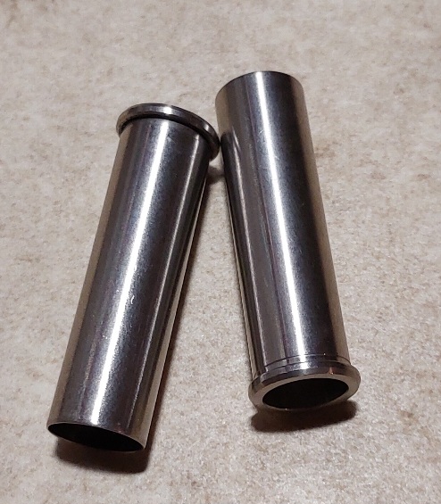 2 Stahlhülsen Kaliber 38 für 8 mm Platzpatronen, 34 mm lang.