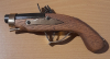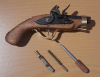 Hallo, ich verkaufe hier eine alte Steinschloss Vorderlader – Reise – Taschenpistole. Irgendwelche Punzen, Beschriftungen, Beschussstempel oder der Gleichen sind nicht vorhanden oder zu erkennen. Über ihr Alter oder Hersteller kann ich leider nichts sagen. Sie hat leider ein Manko – Ausgebaut schlägt der Hahn recht stramm ab und rastet auch in allen Stufen ein – eingebaut ist der Abschlag müde und sie rastet nur in der ersten Stufe ein. Da ich nun mal kein Fachmann für solche Waffen bin habe ich es vermieden hier Hand anzulegen. Ich habe mit einem Trick (weil sie nicht von selbst Zündet) ein paar Kugeln abgefeuert – Schießen tut sie – sie hat auch erkennbar ein leichten, noch vorhandener Drall – Das Kaliber ist 33 - wer sie reaktivieren will sollte sie vorher einer Revision unterziehen, hier steht jeder selbst in der Verantwortung. Ich hatte sie ausschließlich als Sammlerstück nicht zum Schießen. Ich verkaufe sie daher hier als Ersatzteil, Bastler – Restaurationsobjekt, zurzeit nicht Schuss fähig. Die Putzstange nebst Bürste und Wollwischer gehören mit zur Auktion. Bitte sich die Bilder ansehen, auf Wunsch kann ich aber noch welche zusenden. Hier noch ein Hinweis aus gegebenem Anlass – Sie ist Alt – ist nicht Makellos – hat sicherlich den einen und anderen Fehler – ich beschreibe hier nicht jede Kleinigkeit, ich bin kein Fachmann oder Sachkundiger für alte Vorderlader oder Grundsätzlich für Vorderlader – ich Beschreibe hier alles so gut ich kann und weiß – sie kaufen das was sie sehen. Fragen stellt bitte vorher wer damit nicht einverstanden ist bitte nicht bieten. Und zum Schluss noch das Übliche dies ist ein Privatverkauf daher Garantie - Rückgabe - Umtausch und der gleichen Ausgeschlossen.