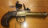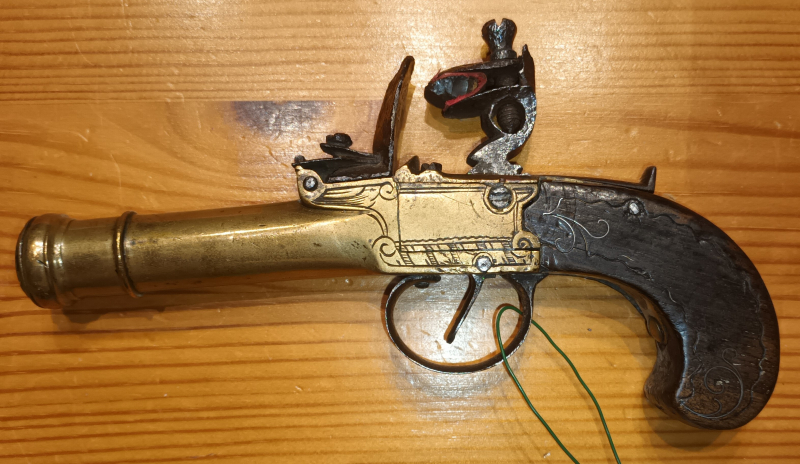 sie bieten auf eine schöne original Steinschlosspistole (018) mit Messingkasten und Messinglauf. Der Lauf öffnet vorne etwas tromblonförmig.
