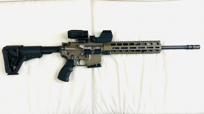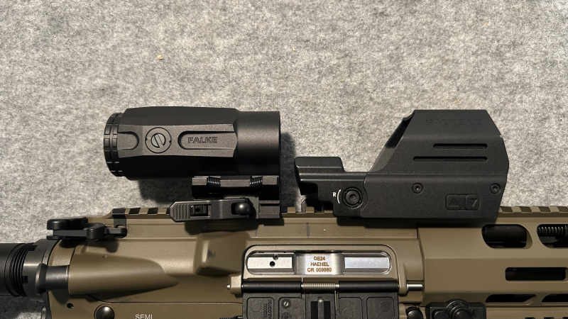 Die Büchse ist mit dem sehr hochwertigem Reflexvisier Falke LE QL Gen2 und dem Falke Magnifier B5X LE FlipUp ausgestattet und damit auch eingeschossen.