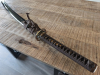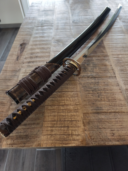 Tolles Katana bzw. Shinken zu verkaufen. Die 73 cm lange Klinge (-mit Habaki) aus Kohlenstoffstahl wurde handgefertigt in Kobuse geschmiedet. Die Härtelinie/Hamon wurde traditionell mittels Lehmbestrich gefertigt. Zudem ist die Klinge rasiermesserscharf und auf Hochglanz poliert. Der 27 cm lange Griff ist mit schwarzer Rochenhaut unterlegt. In die lackierte Saya wurde ebenfalls Rochenhaut eingearbeitet. Alle Zierrate des Samuraischwertes zeigen Drachenmotive. Das Katana wurde nie für Tameshigiri oder ähnliches genutzt und befindet sich in einem sehr guten Zustand. Tolle Gelegenheit für Sammler und/oder Budokas! Weitere Bilder auf Anfrage.