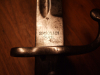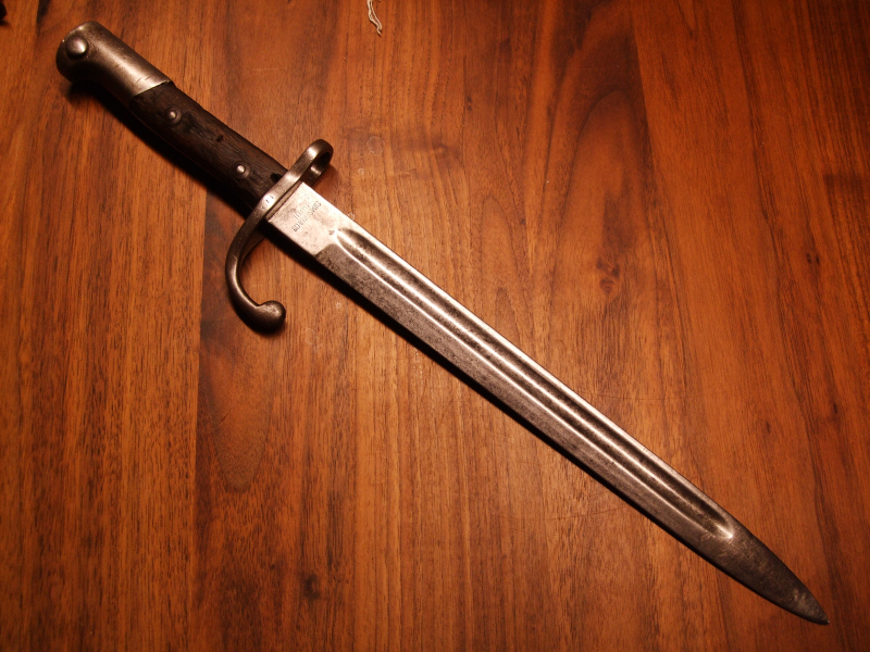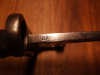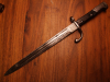 Auf der Fehlschärfe befindet sich ein ovaler Kreis mit den Buchstaben R B , die Holzgriffschalen sind vernietet und durch das Alter entsprechend nicht mehr so schön, siehe Bilder. Der Drücker ist voll Funktionsfähig. Das Bajonett hat eine Länge von ca. 424 mm und die Klinge ist ca. 292 mm lang.
