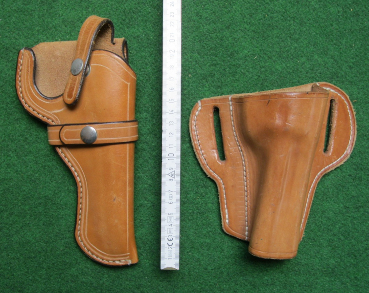 Verkaufe 2 Revolverholster. Die Holster zeigen Trage- und Gebrauchsspuren auf. Die Nähte sind fest und im originalen Zustand. Zustand gemäß Fotos.