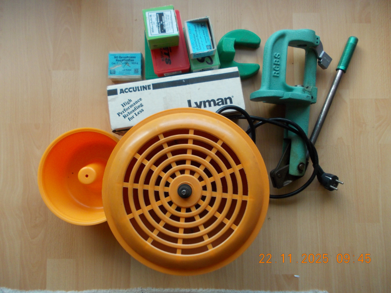 Aus Nachlass, verschiedene Wiederladeartikel wie RCBS-Presse. Matritzensatz zur 9mm kurz. Lyman-Pulverwaage, Hülsentumbler sowie