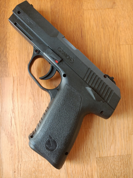 Die Gamo PX-107 ist eine Vollkunststoff Pistole mit gezogenem Lauf und darf nur mit den beiliegenden (Original Gamo) Blei Rundkugeln
