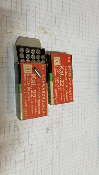 Biete hier 100 Schuss alte RWS Platzpatronen Kaliber 22 Schwarzpulver Ladung, die Patronen sind in einwandfreiem Zustand.