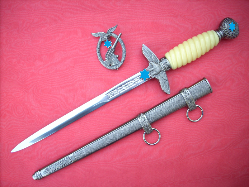Sehr schönes Set: Luftwaffendolch LOD für Offiziere der Luftwaffe mit Verzierungen auf der Klinge. Dabei ein Flakkampfabzeichen. Äußerst geringe Gebrauchsspuren. Kein Herstellerlogo. Sehr guter Zustand siehe Fotos, die, wie immer, Bestandteil der Artikelbeschreibung sind. Keine Garantie und keine Rücknahme.