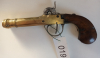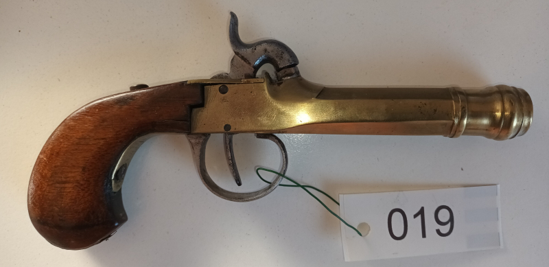 sie bieten auf eine schöne original Perkussionspistole (019) mit Messingkasten und Messinglauf. Der Lauf öffnet vorne etwas tromblonförmig auf 21 mm, das Kaliber dürfte .45 sein, das der Innendurchmesser vorne 12mm beträgt. Die Hahnfeder ist in Ordnung.