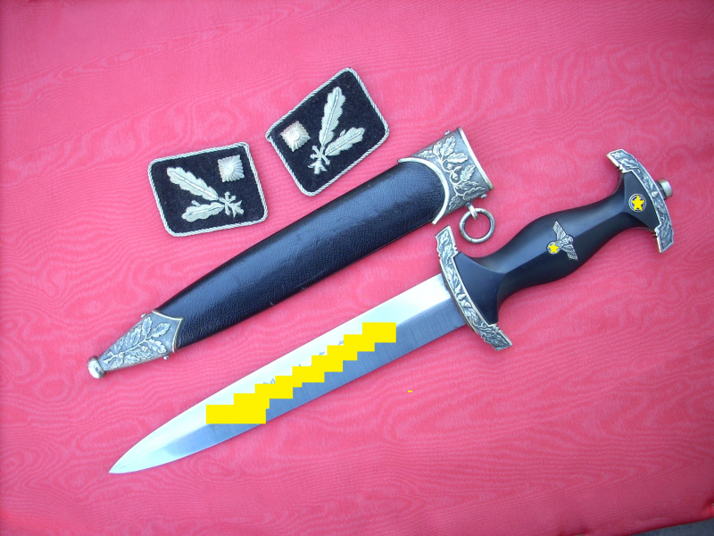 Sehr schönes Set eines SS-Ehren-Dolches mit bezogener Scheide und Verzierungen, sog. Himmler-Dolch mit rückseitig eingeätzter Himmler-Widmung (In herzlicher Kameradschaft H.Himmler) und einem Paar Kragenspiegel für einen SS-Brigadeführer/Generalmajor (metallfaden handgestickte Eichenblätter mit Rangsternen aus Metall). Alle Eichenlaub-Teile des Dolches äußerst filigran ausgearbeitet, Klinge mit Stoßleder. RZM-Herstellercode RZM M7/36 (steht für E. & F. Horster, Solingen). Das Motto auf der Vorderseite der, durch viele schöne Pliestspuren aufgewerteten Klinge, sowie die Widmung auf der Rückseite ordentlich und schön tief geätzt. Klinge, Scheide, Schrauben und Tragering magnetisch, die übrigen Metallteile antimagnetisch. Adler und Pastille akkurat eingesetzt, Pastille sauber emailliert. Kopfschraube und Beschlagschrauben unbeschädigt. Gesamtzustand siehe die Fotos, die, wie immer, Bestandteil der Artikelbeschreibung sind. Leichte Gebrauchsspuren. Keine Garantie und keine Rücknahme.