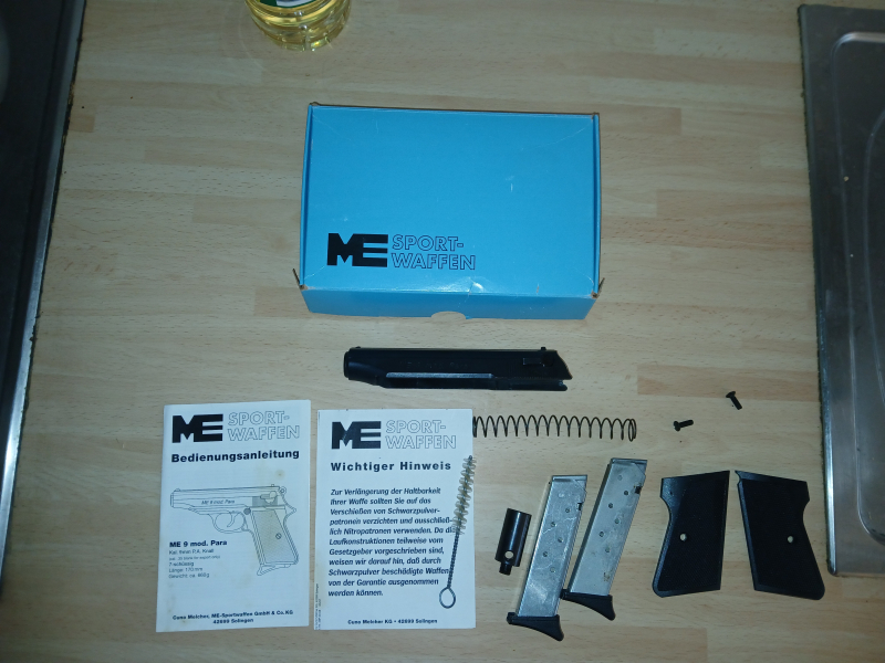 Verkaufe diese sehr gut erhaltenen Ersatzteile für eine ME 9 Mod. Para Kaliber 9mm P.A., bestehend aus 2 Magazinen ( eins davon neuwertig), einen Verschluss mit leichten Gebrauchsspuren in form von 4 weissen Flecken, 1 Paar Griffschalen mit Schrauben, Originalverpackung, Abschussbecher und Bedienungsanleitung. Das Griffstück ist defekt und gehört nicht mit zur Auktion.