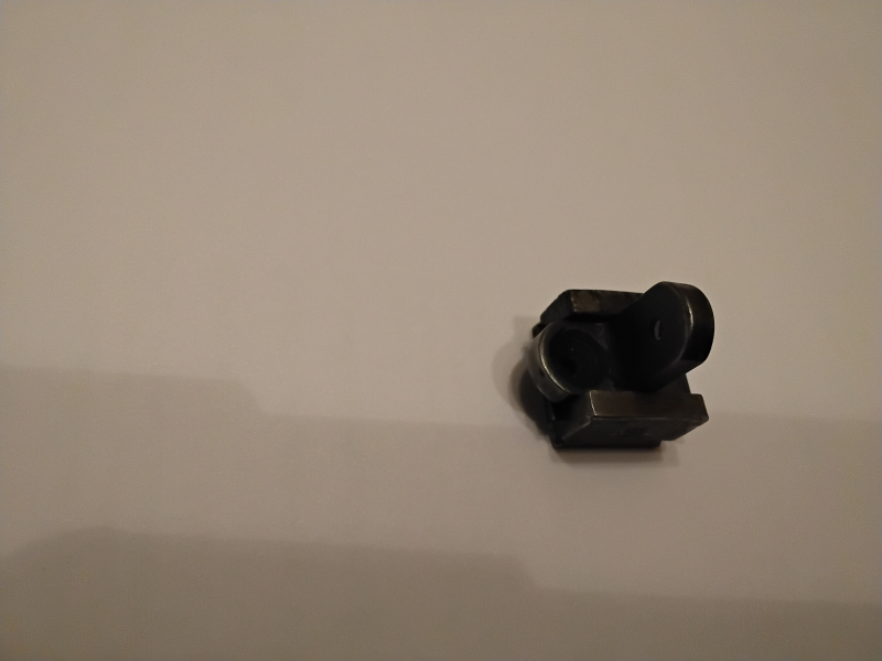 Sehr seltenes Klappvisier für den M1 Carbine. Klappfunktion ist stramm und es rastet zudem wackelfrei ein. Mehrere Rostnarben sowie Kratzer und Spuren vom Heraustreiben aus der Schwalbenschwanzfräsung der Waffe. Das Lochvisier ist mit einem U gestempelt. Versand versichert mit Sendungsnummer.